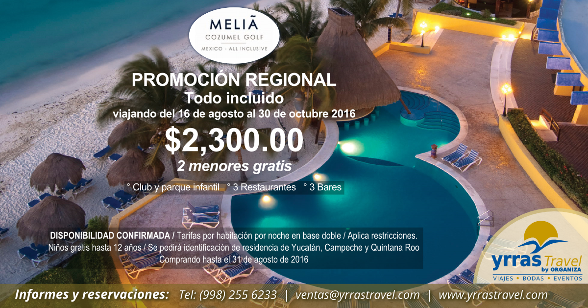 DISPONIBILIDAD CONFIRMADA | Tarifas por habitación por noche en base doble | Aplica restricciones | Niños gratis hasta 12 años | Se pedirá identificación de residencia en Yucatán, Campeche o Quintana Roo | Comprando hasta el 31 de agosto de 2016.